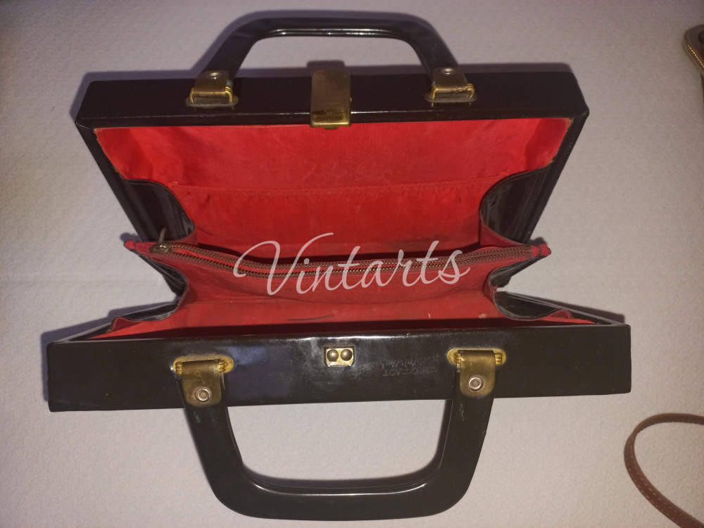 В ЦЕНТРЕ: Сумка с короткой ручкой "жесткой формы", цвет черный, подкладка красного цвета, лаковая кожа, состояние отличное. Размеры: длина 28см., высота 20см. - цена 6 500 руб.